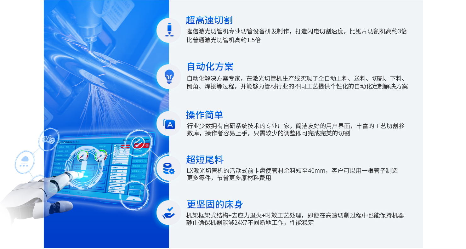 管材加工智能生產(chǎn)線(xiàn),高度靈活的模塊化設(shè)計(jì),多環(huán)節(jié)集成一體,實(shí)現(xiàn)自動(dòng)化生產(chǎn),減少人力成本,提高效率??筛鶕?jù)行業(yè)需求定制,多種智能加工模式助力企業(yè)快速投產(chǎn)。